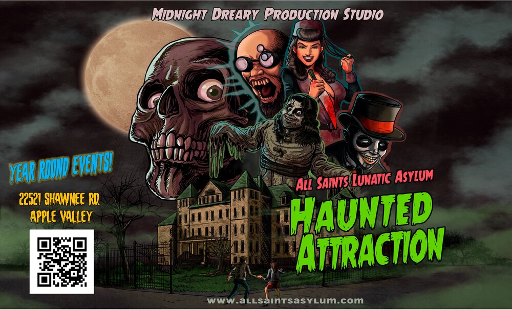 All Saints Asylum opens their doors October 2nd-November 1st, 7-10pm (hours may vary) only $15. Located at 22521 Shawnee Rd. Apple Valley, CA.