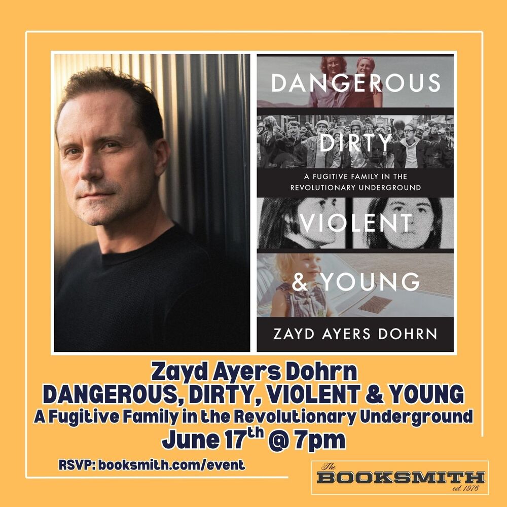 Join us on Wednesday, June 17th at 7pm as we welcome Zayd Ayers Dohrn to the store for the release of Dangerous, Dirty, Violent, & Young. RSVP is not required, but appreciated. Seats are limited and can be guaranteed with the purchase of a book or a $3 sliding scale donation to our program.